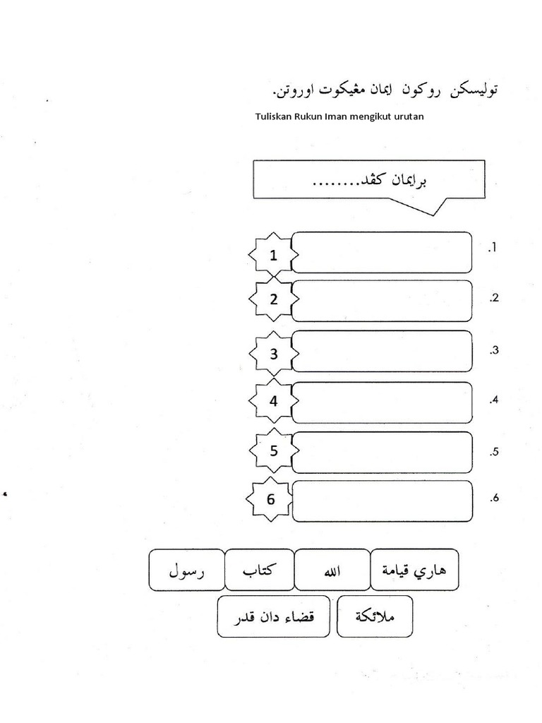 Memberikan sebagian harta kepada fakir miskin atau golongan yang berhak menerimanya. Menyatakan tiada tuhan selain allah, dan muhammad itu utusan allah. Murid menyusun kad rukun islam mengikut urutan kemudian menyebutnya dalam kumpulan. Guru menunjukkan carta rukun islam. Berikut ini adalah penjelasan lebih lengkap dari lima amalan dalam rukun islamm. Hal ini wajib hukumnya untuk dilakukan bagi setiap orang untuk menjadi muslim. Susun rukun solat di bawah mengikut urutan yang betul. Contoh pelafalan yang benar misalkan: Selama ini kita memahami bahwa urutan rukun islam adalah syahadat, shalat, zakat, puasa, haji. Mendirikan shalat wajib lima waktu sehari. Islam berhubungan dengan amalan, dan ibadah secara fisik. Disebutkan di awal dalam rukun iman karena iman kepada allah adalah pondasi. Apakah maksud beriman?, rukun iman ada berapa?, sebutkan rukun iman mengikut urutan., beriman pada hari kiamat ialah rukun iman yang ke berapa?, kitab injil di turunkan kepada nabi apa?, kitab injil diturunkan dalan bahasa apa?, allah turunkan kitab zabur kepada nabi musa., hari kiamat ialah hari kehancuran., berikan salah satu nama lain bagi hari kiamat., allah menceritakan tentang hari kiamat di dalam surah apa?, malaikat jibril tugasnya meniup sangkakala?, semua manusia dan jin akan di.